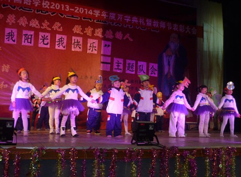 隊(duì)會(huì)在莊嚴(yán)的少先隊(duì)出旗曲中拉開序幕,少先隊(duì)隊(duì)歌《我們是共產(chǎn)主義接班人》響徹大廳。整個(gè)隊(duì)會(huì)采用互動(dòng)形式,臺(tái)上臺(tái)下融匯一起,小學(xué)一至六年級(jí)的同學(xué)們?cè)谖枧_(tái)上用文藝形式表現(xiàn)出學(xué)校貫行“陽光教育”的主題,青年教師也著裝上臺(tái)朗讀,表達(dá)了爭做陽光教師的心聲,一曲《陽光總在風(fēng)雨后》將教師團(tuán)結(jié)合作,共建陽光和諧校園。