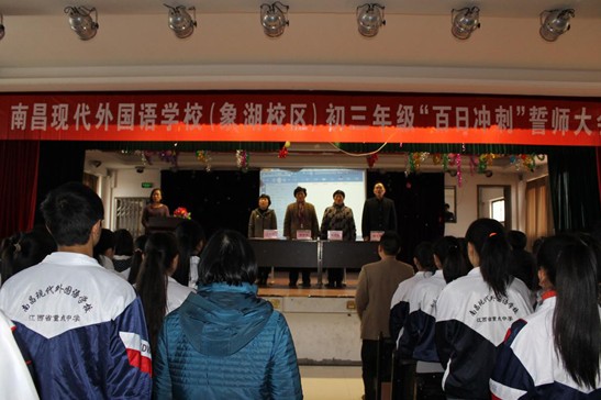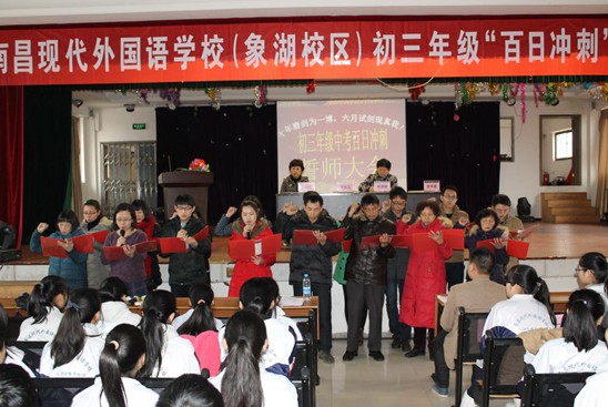 3月7日下午,南昌現(xiàn)代外國語學校(象湖校區(qū))初三年級全體師生和部分家長代表共600多人,齊聚報告廳一同向中考百日宣誓。慷慨激昂的誓言,久久在象湖湖畔回蕩。