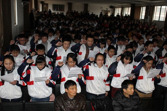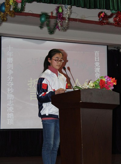 最后,師生們共同宣誓。全體初三年級組班主任和任課教師承諾,始終跟同學們在同一個“戰(zhàn)壕”,始終充滿激情,和同學們朝夕相處,同甘共苦,同舟共濟,竭盡全力,誓為同學們搖旗吶喊,誓為同學們保駕護航。無論成功與否,將是每一位同學的堅強后盾。在各班班長帶領下,該校初三學生也分別宣誓。師生們的誓言鏗鏘有力,響徹整個會場,充滿激情,銳不可當。他們信心百倍,誓獲2014年中考全勝!