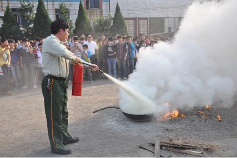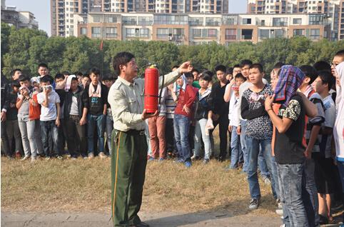 一陣急促的警報聲拉開了“師生安全疏散演練”活動的帷幕,聽到警報聲,各位老師立即到達指定崗位,指導學生快速疏散,各班班主任帶領學生彎著腰、貓著步,捂住口鼻,沿著學校指定樓梯口快速前進,有序撤離到學校操場的安全地帶,隨即清點人數,并層層向上匯報校領導。全校師生全部安全疏散完畢后,學校還邀請了工商學院保衛處處長周圣華對全體師生從如何報火警、火災的預防、火場自救及逃生方法等消防安全基本常識進行了講解。同時,周圣華還現場演示了滅火器的操作程序,教導同學們如何正確使用滅火器,并指導同學們現學現用,現場使用滅火器撲滅火源。