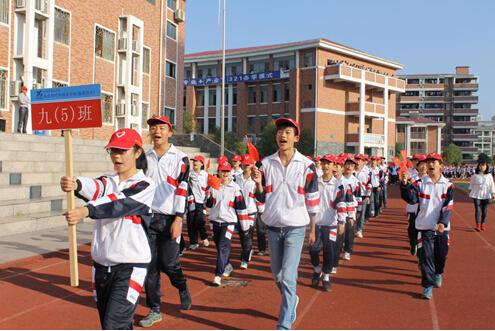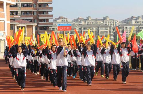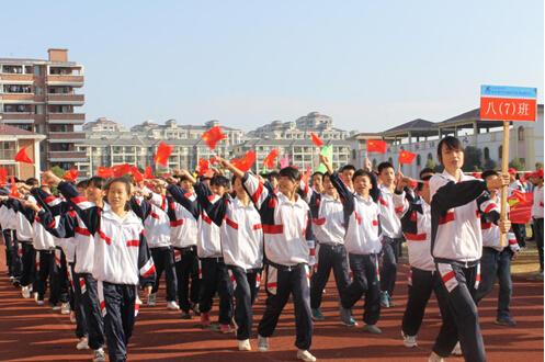 雄壯的《運動員進行曲》奏響后,入場式開始。走在最前面的是儀仗隊的同學們,他們手托國旗、校旗,手舉彩旗,氣宇軒昂,精神抖擻。隨后,各年級代表隊昂首闊步依次入場,接受大會主席團的檢閱。他們或高舉橫幅,或手持標語牌,或齊呼口號,表達著自己的信心與熱情。
