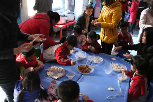 親子游戲結束后,家長和孩子們幸福地圍坐在一起調餡、包餃子。在各位家長的指導下,孩子們小心翼翼的學著包餃子:仔細的放餡,輕輕的捻餃子皮,可認真了!一個個富有創意的餃子在孩子們手中綻放。整個活動歡聲笑語,其樂融融,流淌著暖暖的親情,洋溢著濃濃的節日氣氛。看著自己完成的作品,吃著自己包的餃子,孩子們的臉上露出了得意興奮的表情。