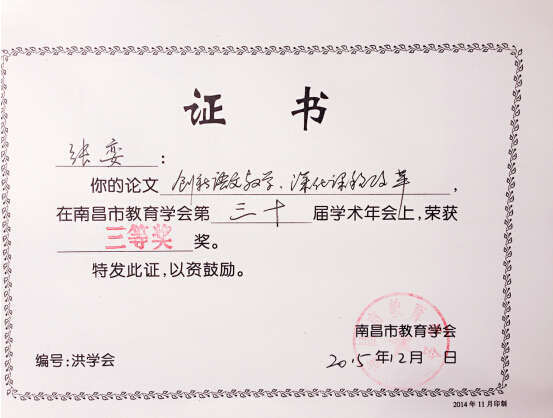 南昌現(xiàn)代外國(guó)語(yǔ)學(xué)校(象湖校區(qū))長(zhǎng)期注重發(fā)揮教育理論的引領(lǐng)作用,通過(guò)搭建各類(lèi)信息平臺(tái),指導(dǎo)教師將教育理論與教育教學(xué)實(shí)踐緊密結(jié)合。廣大教師始終注重課堂教學(xué)效益,不斷提升教學(xué)實(shí)踐水平和教學(xué)研究水平,教學(xué)之余積極參與各種論文征集、交流、發(fā)表活動(dòng)。近日,在南昌市教育學(xué)會(huì)第三十屆學(xué)術(shù)年會(huì)上,我校張小梅老師撰寫(xiě)的論文《淺談低年級(jí)學(xué)生閱讀興趣的培養(yǎng)》和張孌老師撰寫(xiě)的論文《創(chuàng)新語(yǔ)文教學(xué),深化課程改革》,榮獲三等獎(jiǎng)。希望獲獎(jiǎng)教師再接再厲,繼續(xù)為推動(dòng)學(xué)校教研工作而努力,同時(shí)也希望其他教師能積極撰寫(xiě)論文,參與各級(jí)各類(lèi)的論文評(píng)比活動(dòng),為全面推進(jìn)學(xué)校發(fā)展作出貢獻(xiàn)。