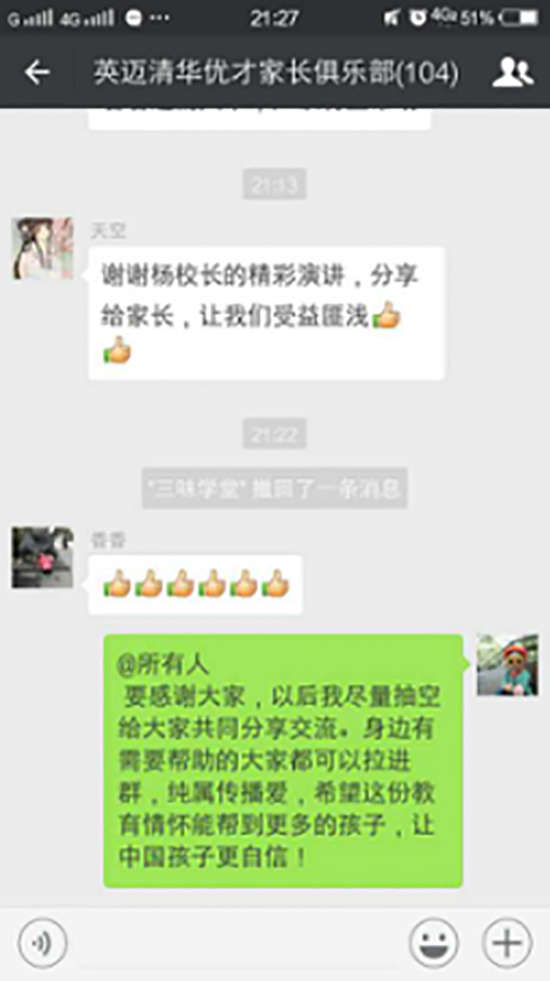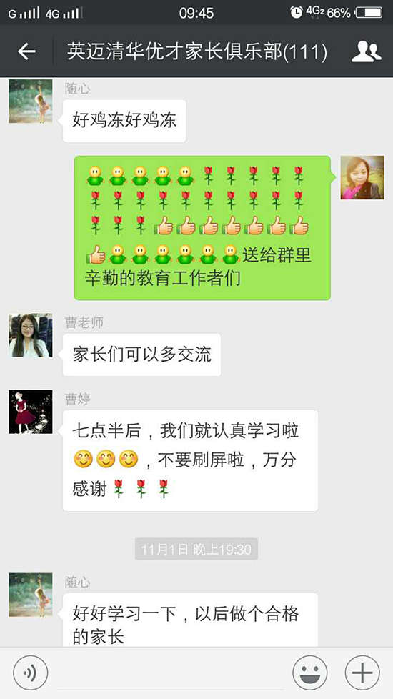 為了豐富教學內容,創新教學模式,加大家長的參與度,南昌英邁優才培訓學校采用網上微課堂的形式開展家庭教育活動,該活動利用微信平臺,建立家長微信群,通過發送語音消息的形式,跟家長溝通家庭教育方面的問題,眾多家長紛紛參與,并給出高度評價。此次“空中微課堂”活動是南昌英邁優才培訓學校楊校長結合她平時的教學經驗進行的一次創新。
