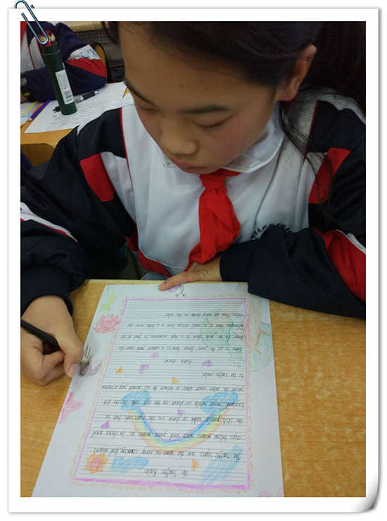 很多學(xué)生的英文書寫也非常有創(chuàng)意,他們結(jié)合生活實際,展開豐富的想象,用巧妙的構(gòu)思來書寫創(chuàng)作。比如,他們以夏日的彩虹,蜻蜓荷花為主題,來表現(xiàn)對英語學(xué)習(xí)的熱情和興趣……