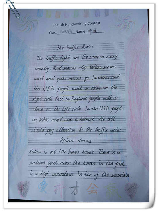 英語書寫創(chuàng)意比賽,豐富了學(xué)生英語學(xué)習(xí)的課余生活,激發(fā)了學(xué)生對英文書寫美感的熱情,同時也培養(yǎng)了學(xué)生的的創(chuàng)新能力,為學(xué)生提供了一個展示自我的舞臺。