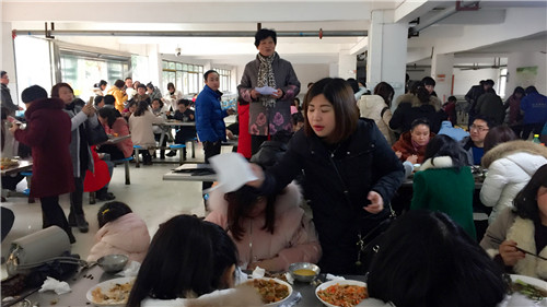 金猴報(bào)歲一年去,雄雞啼春好景來。2017年1月17日下午,南昌現(xiàn)代外國語學(xué)校(象湖校區(qū))食堂歡聲笑語,喜氣洋洋。全校教職員工齊聚一堂,以聚餐的形式為自己一年的努力喝彩!這是一個(gè)幸福快樂的家庭聚會(huì),一個(gè)230多個(gè)教職員工的大家庭,勞作了一年,聚在一起,品嘗汗水培育的果實(shí)的聚會(huì)。會(huì)上,李金玉校長作了新年賀詞,她說:“我們有緣相聚在聚仁堂集團(tuán),在大家的共同努力下,我們學(xué)校發(fā)展規(guī)模上了一個(gè)新臺(tái)階。今天讓我們共同舉杯,慶祝本學(xué)期工作圓滿結(jié)束,祝愿大家過一個(gè)萬事如意平安年,夢想成功發(fā)財(cái)年”。副校長胡卓越彈起了手風(fēng)琴,一同和老師開心得歡樂起來。食堂大姐端來甘甜的美酒,讓大家開懷暢飲。一時(shí)間,會(huì)場沸騰起來了,歌聲、笑聲、喊聲,大家在把酒言歡中交流新年愿望。對酒當(dāng)歌,人生幾何,老師們盡情揮灑自己身為現(xiàn)外人的幸福!