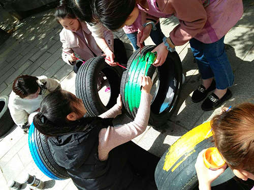 輪胎作為一種低結構廢舊材料,有無限的利用和創意空間,既能美化幼兒園環境,又能促進幼兒的體、智、能發展。為了給孩子們提供更加豐富多彩的游戲材料,迪斯尼·金沙園積極收集大量不同型號的廢舊輪胎,2017年3月28日上午,楊園長帶頭組織教師們利用課余時間,大膽進行創意彩繪活動,對輪胎進行美化。
