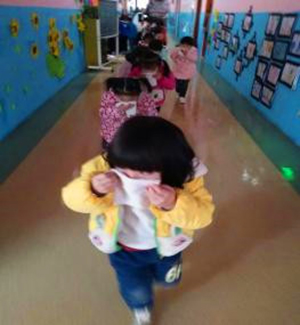 活動中,隨著幼兒園消防警報聲響起,全園教職工立即停下手中的工作,各班教師迅速按緊急預案的疏散線路帶領幼兒拿起濕毛巾,捂住口鼻、貓著身子,彎腰小步快走,在老師的指揮下按指定的路線,沿著各通道安全出口,緊張有序逃離到指定地安全場地集合,老師迅速地清點人數,并向總負責人報告。