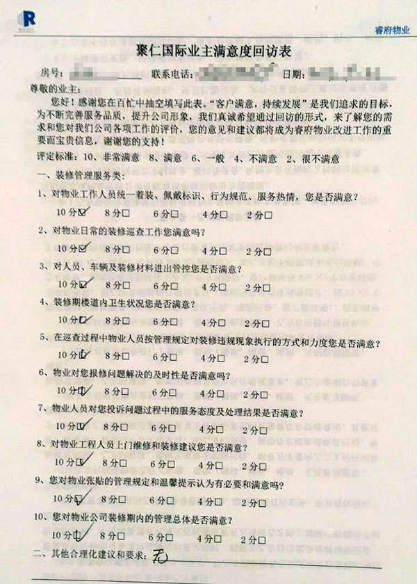 近日,睿府物業品質部采取走訪、發放調查問卷、電話等方式,對6號樓裝修期業主進行回訪,對業主裝修期間提出的每一個意見做出反饋,切實解決各類突出問題。
