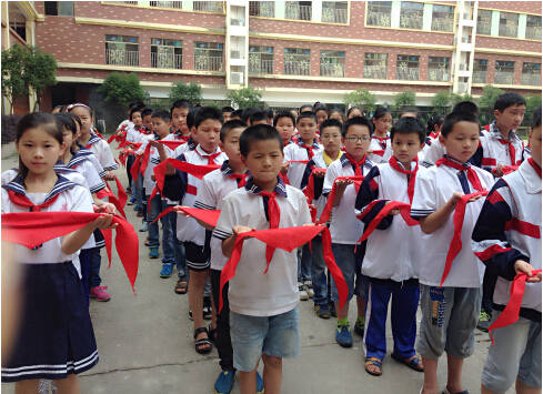 “我們是共產主義接班人,繼承革命先輩的光榮傳統,愛祖國,愛人民,鮮艷的紅領巾飄揚在前胸……”伴隨著嘹亮的中國少年先鋒隊隊歌,學校大隊輔導員謝珊珊老師宣讀了新隊員名單,六年級少先隊員向新隊員敬隊禮,為新隊員佩戴了鮮艷的紅領巾,183名小學生被批準加入中國少年先鋒隊組織,正式成為光榮的中國少年先鋒隊隊員了;大隊輔導員代表全體老師們表達了對新隊員的祝福,寄語全體少先隊員養成良好的學習、生活習慣,為胸前的紅領巾增光添彩,并號召大家用自己的行動證明自己無愧于少先隊員這個神圣的稱號。新隊員在隊旗下莊嚴宣誓、呼號——“為共產主義事業而奮斗,時刻準備著!”