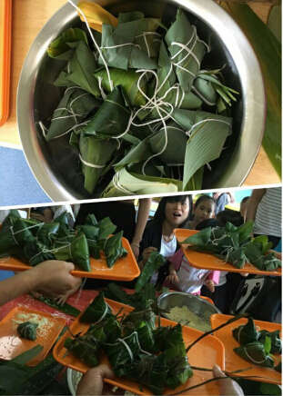 孩子們饒有興致地觀看了家長們包粽子的過程,家長們嫻熟的包粽子技術,令孩子們不停地拍手叫好,各年輕家長也躍躍欲試,現(xiàn)場拜師學藝,認真仔細的模仿每一個細節(jié),三角形、棱形、枕頭形……五花八門的粽子出爐了,場面壯觀!