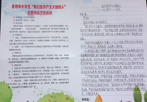 為深入貫徹團(tuán)市委、市教育局、市學(xué)聯(lián)、市少工委《關(guān)于在青少年中深入開展“我們是共產(chǎn)主義接班人”主題團(tuán)、隊(duì)宣傳教育活動的通知》的文件要求,進(jìn)一步引導(dǎo)廣大共青團(tuán)員、少先隊(duì)員樹立共產(chǎn)主義遠(yuǎn)大理想,堅(jiān)定跟黨走中國特色社會主義道路的信念和信心,增強(qiáng)青少年對黨和社會主義祖國的樸素感情,近日,南昌現(xiàn)代外國語學(xué)校(象湖校區(qū))積極組織全校學(xué)生開展了以“我們是共產(chǎn)主義接班人”為主題的書信文化活動。此次活動旨在通過專用郵資信封和信箋作為載體,以傳統(tǒng)書信傳遞真情的形式,深化團(tuán)員和少先隊(duì)員對實(shí)現(xiàn)遠(yuǎn)大理想要靠廣大青年腳踏實(shí)地奮斗的認(rèn)識理解,讓青少年認(rèn)識到共產(chǎn)主義理想的實(shí)現(xiàn)需要一代又一代人的接力奮斗,鼓勵學(xué)生們不僅僅要做一名好學(xué)生,更要成為一個有所擔(dān)當(dāng)?shù)墓伯a(chǎn)主義接班人。