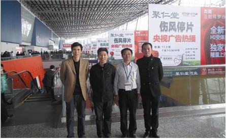 聚仁堂藥業(yè)領導團隊在第68屆全國藥交會現(xiàn)場傷風停片大幅廣告前合影