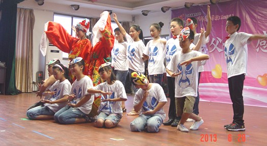 此次文藝演出圍繞“感恩”主題,頌揚了父母、老師及社會對孩子的培養之情,同學們以豐富多彩的文藝節目展現了校園生活,反映了他們的快樂和感恩之情。舞臺背景上醒目的標識:“感恩父母、感恩老師、感恩社會”及2個敬禮的少先隊員的畫面,構建了會場濃濃的感恩氛圍。開場時嘹亮的鼓號聲奏響了孩子們的前進誓言,拉開了表演的序幕。隨后,精彩的節目一一登場,《大家一起來》、《印度天使》是小學一、二年級小朋友們帶來的節目,他們年紀雖小,但舞蹈水平不低,整齊劃一的動作、天真無邪的笑容,不禁讓人心生憐愛;《英語歌曲串燒》、《中華武術魂》、《戲曲聯唱》不僅給大家帶來驚喜,也從不同的側面反映出了校園文化生活的豐富多彩。令人忍俊不禁的是三(1)班的《江南style》,胖胖的“鳥叔”一上場,臺上臺下都響起了一片歡呼聲,將演出推向了高潮!